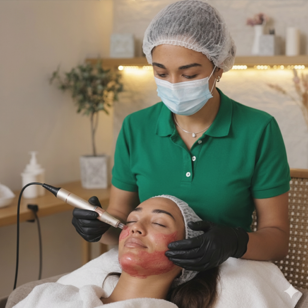Sterile cartridge installed on the microneedling device, adjusted to the correct depth for your skin goals.